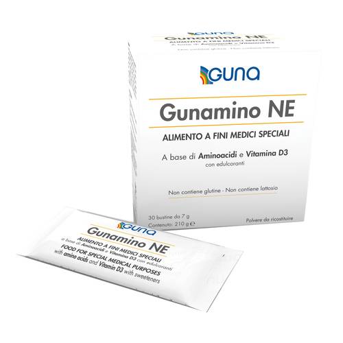 Gunamino NEDescrizione Alimento a fini medici speciali con edulcoranti a base di aminoacidi essenziali e vitamina D3 indicato per la gestione dietetica di pazienti disfagici, in caso di sarcopenia senile e neoplastica, nei casi di malnutrizione proteica e patologie con perdite della massa muscolare. Data l'elevata solubilità e la bassa viscosità può essere assunto per via orale o via artificiale (sondino NG o PEG) in seguito a dissoluzione in acqua. Ingredienti L-leucina, L-valina, L-isoleucina, L-lisina, L-fenilalanina, L-treonina, maltodestrina, destrina (fibra di mais) parzialmente idrolizzata; edulcoranti: isomalto, sucralosio; L-...