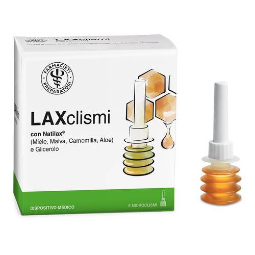 FARMACISTI PREPARATORI LAXCLISMI Descrizione Dispositivo medico. Prodotto monouso per uso rettale a base di glicerolo e Natilax (miele, malva, camomilla, aloe) di durata e azione temporanea, per regolarizzare i movimenti dell'intestino e favorirne lo svuotamento. Modalità d'uso È consigliabile utilizzare una volta al giorno. In caso di necessità ripetere l'applicazione, senza superare la dose massima di 2 microclismi nelle 24 ore. Componenti Per un microclisma da 10 g: glicerolo 7,6 g, NATILAX 1 g (10%), eccipienti q.b. Avvertenze Consultare il medico in caso di assenza di risultati o del persistere della costipazion...